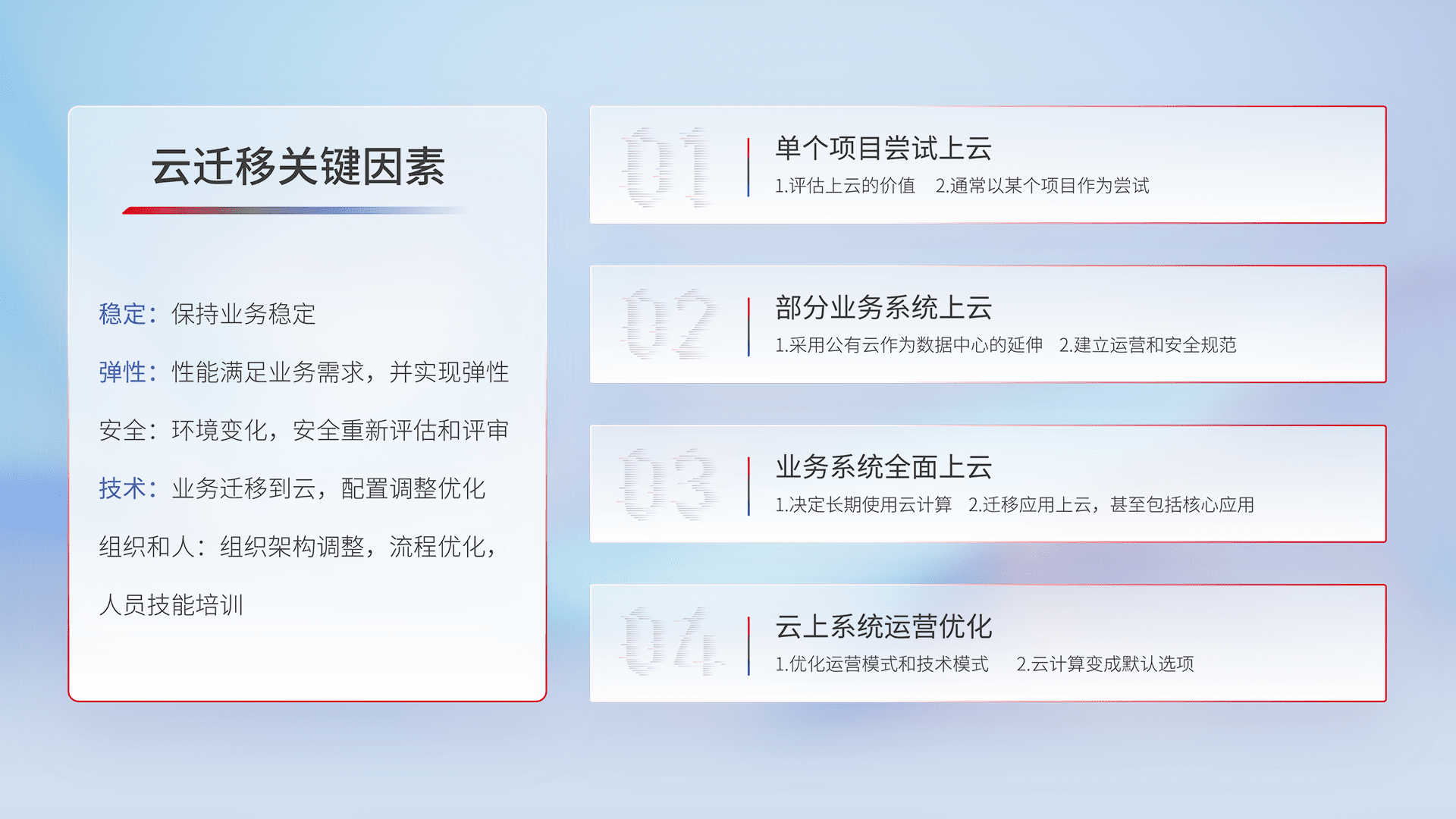 结合实际业务,,,,从规划设计、、、云平台选型、、云原生改造、、、数据迁移、、、、集成交付,,,迁移全过程为客户识别最佳上云路径,,做好风险识别管理,,,设计网络架构、、身份权限、、安全审计合规、、操作审计、、日志审计、、、、监控告警策略、、、、多站点容灾设计等,,,,对云上基础设施进行整体规划,,,提升IT治理水平,,,,以满足弹性、、、高可用、、、高性能的需求。。。。