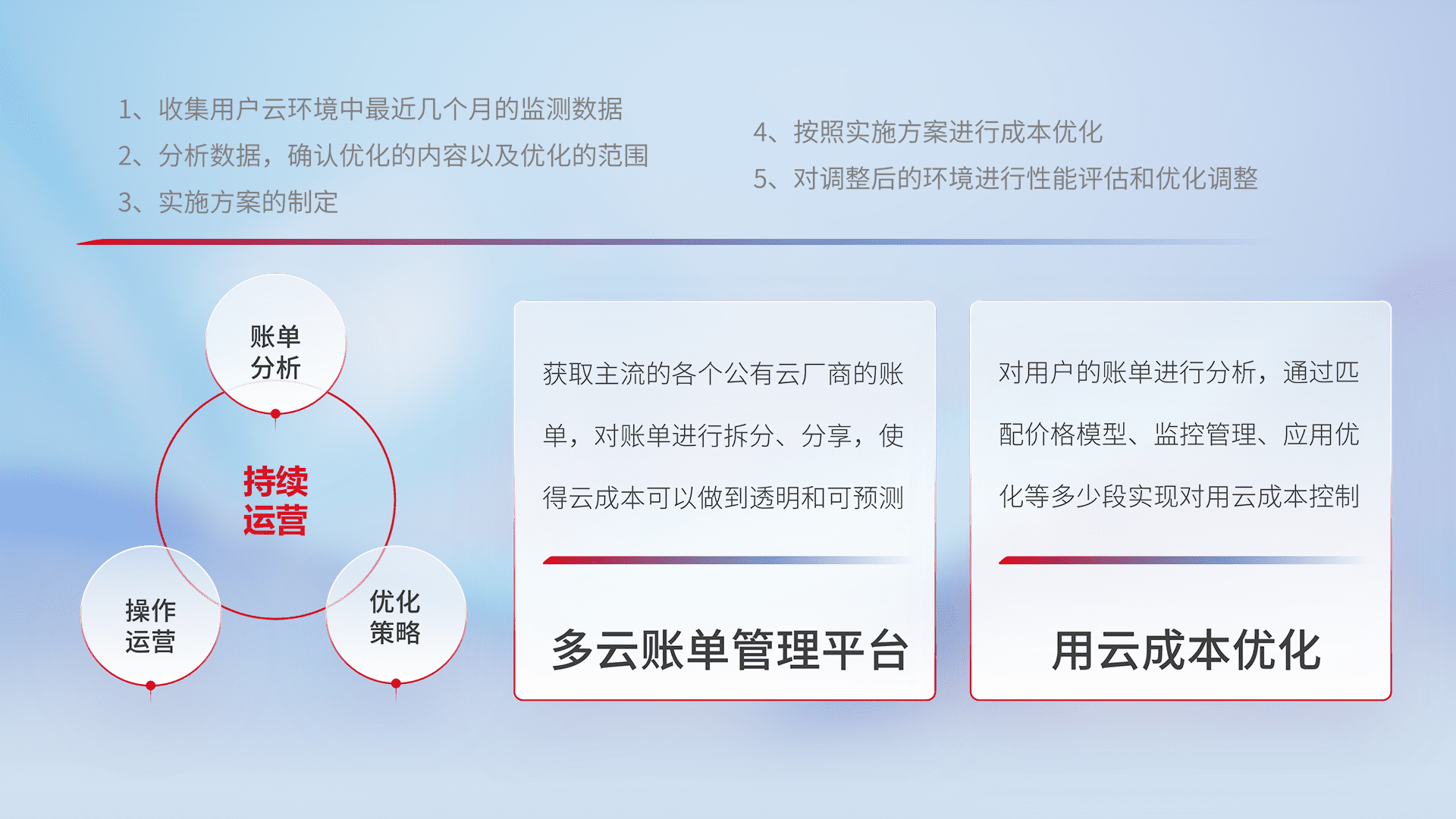 通过多云纳管,,以统一的资源数据模型把客户的云资源进行抽象和封装,,,进而实现对多云资源的统一操作,,,,保障云资源管理的可靠性、、稳定性与可用性。。。量身定制化运维内容,,配置、、、、开发运维、、、、补丁管理、、、、备份、、、、监控、、、、认证和访问管理、、、审计和日常巡检等,,保障在用云过程中的可靠度,,,稳定度以及高可用率。。。